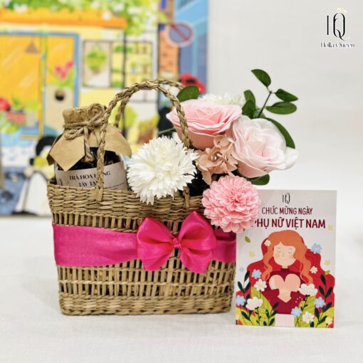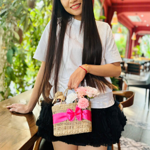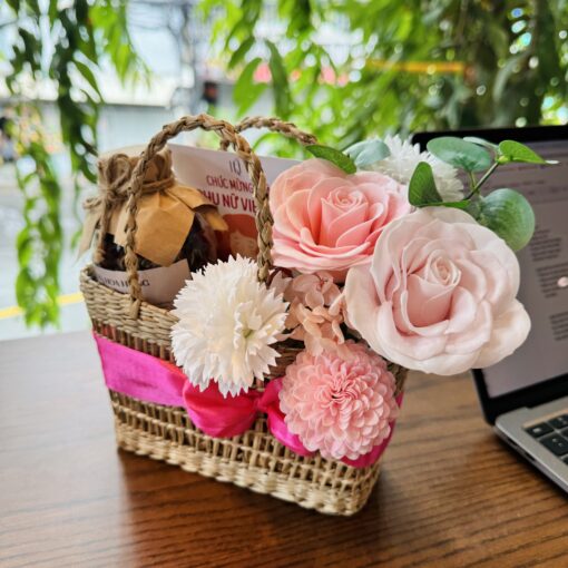 - Giỏ Cói được đan thủ công bằng tay kết hợp với Hoa hồng sáp vĩnh cửu tạo nên 1 chiếc giỏ đầy Mộng mơ. Món quà xanh có thể tái sử dụng lâu bền.